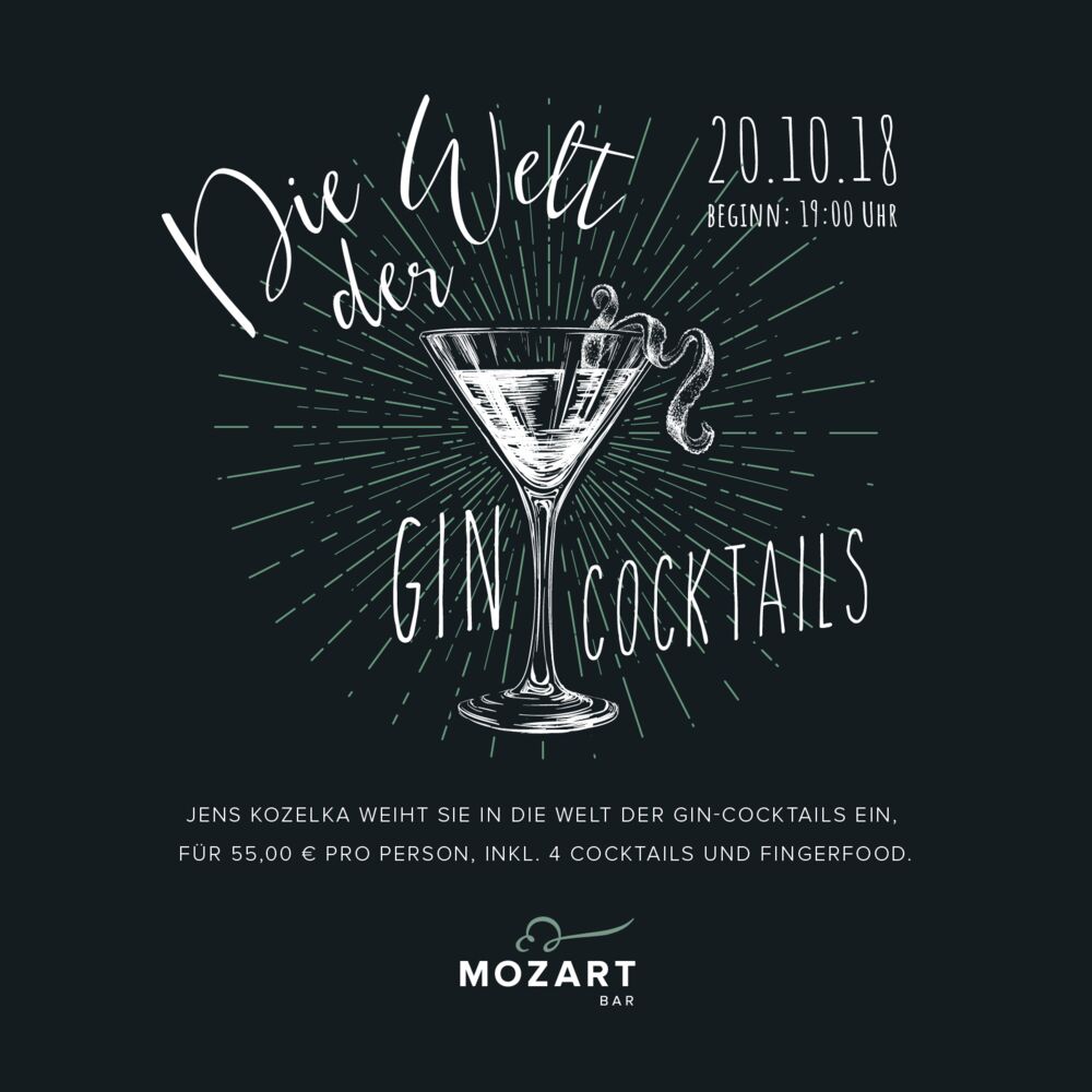 Jens Kozelka weiht Sie in die Welt der Gin-Cocktails ein, für 55,00 € pro Person, inkl. 4 Cocktails und Fingerfood.