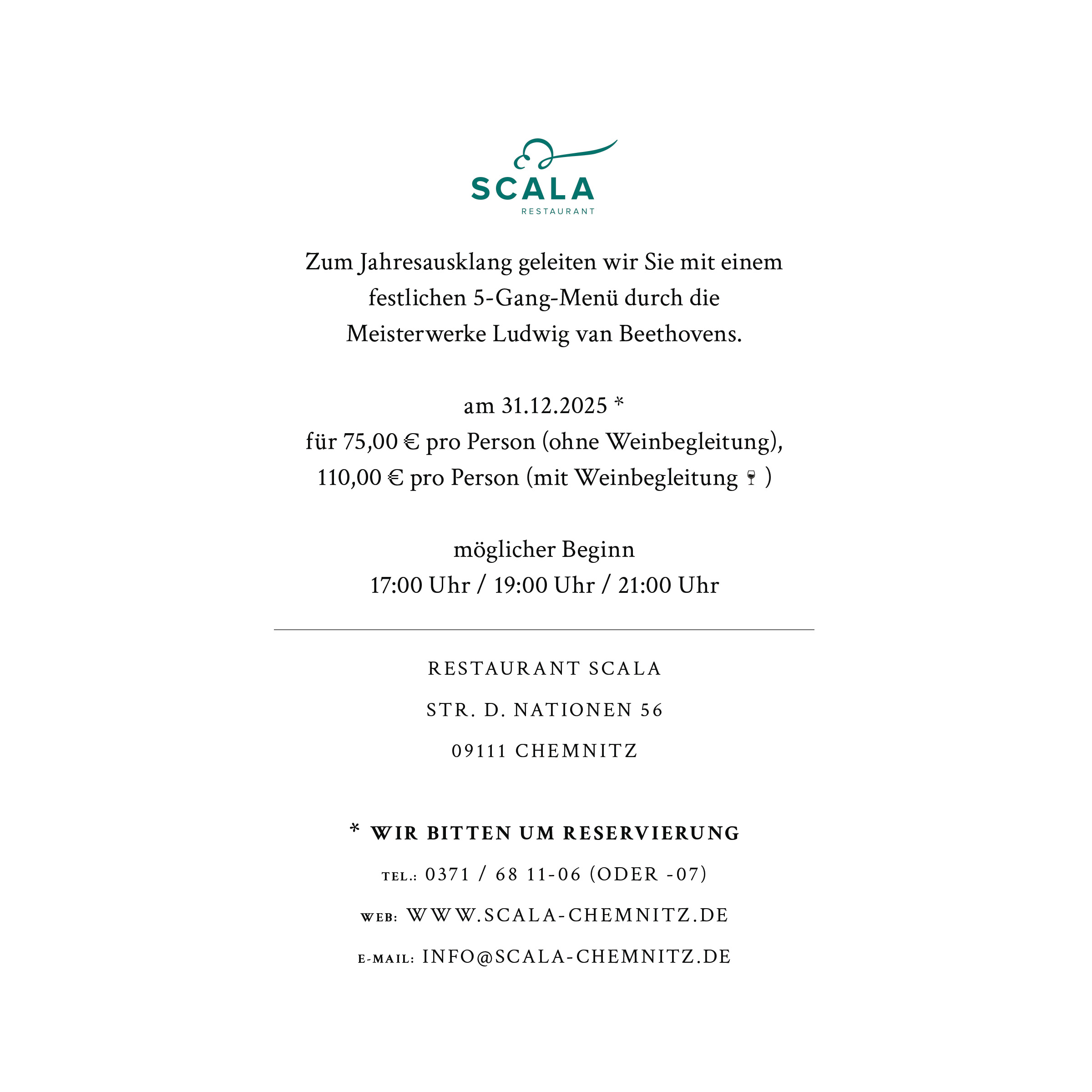 Zum Jahresausklang geleiten wir Sie mit einem festlichen 5-Gang-Menü durch die Meisterwerke Ludwig van Beethovens.