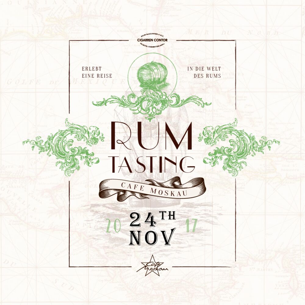 Segelt mit uns auf einer Welle des Geschmacks und lernt die verschiedenen Rumsorten und ihre einzigartigen Facetten kennen. Nehmt Kurs auf das Cafe Moskau und geht 18:30 Uhr an Board. Wir lichten um 19:00 Uhr die Anker und gehen auf eine Geschmacksreise.