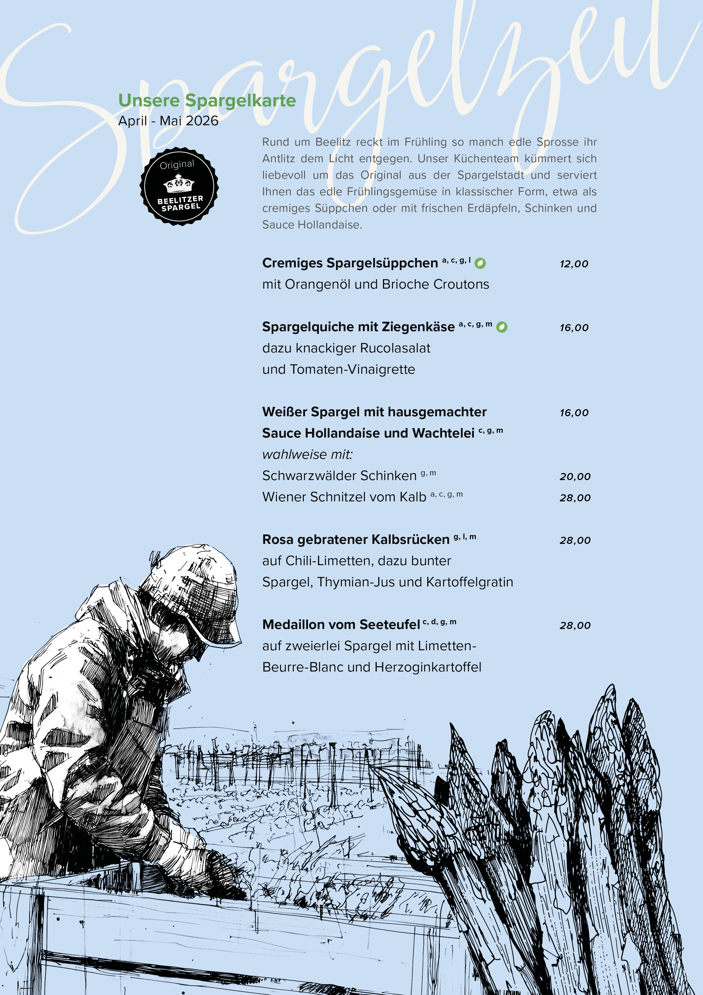 Rund um Beelitz reckt im Frühling so manch edle Sprosse ihr Antlitz dem Licht entgegen. Unser Küchenteam kümmert sich liebevoll um das Original aus der Spargelstadt und serviert Ihnen das edle Frühlingsgemüse in klassischer Form, etwa als cremiges Süppchen oder mit frischen Erdäpfeln, Schinken und Sauce Hollandaise.