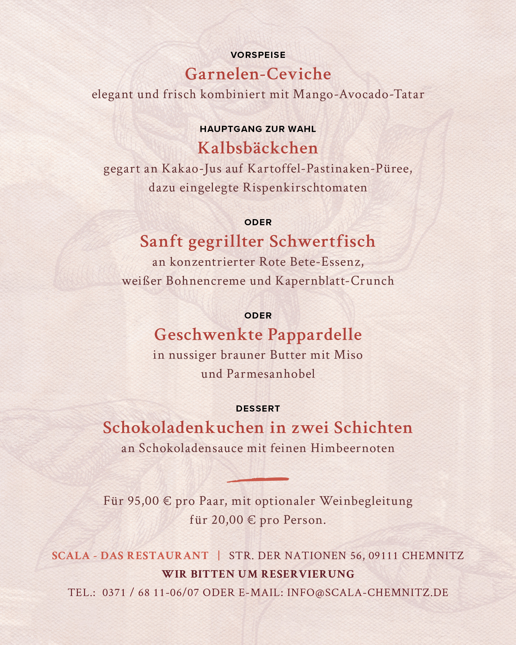 Schenken Sie sich und ihrem Partner oder ihrer Partnerin am 14.02. einen ganz besonderen Abend: Zum Valentinstag betören wir die Sinne aller Liebenden mit unserem aphrodisierenden 3-Gänge-Menü für 95,00 € pro Paar. Mit optionaler Weinbegleitung für 20,00 € pro Person.